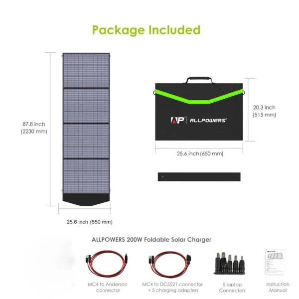 Folded size only 25.6×20.3×2.4inch,13.9lb, portable solar panel 200W is great for traveling the without electricity and won’t take up much room in your bag. ALLPOWERS foldable solar charger features Solar Connector output(25A max), providing endless power for power station in camping, outdoor, garden, motorhome, and caravan under the sun.