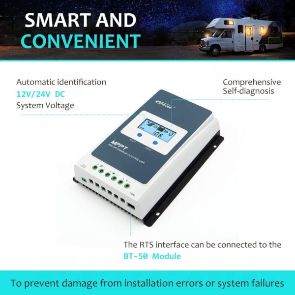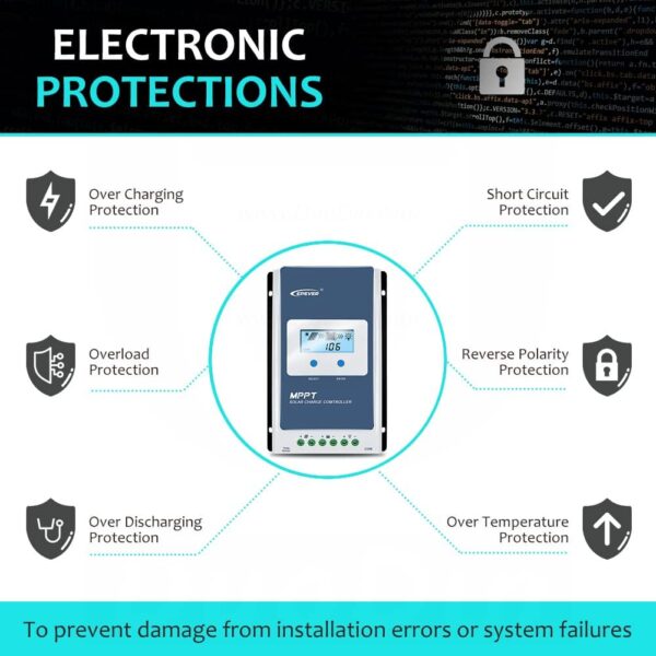 • This controller uses the most advanced MPPT technology to ensure high efficiency (>98%) of your solar system. Significantly outperforms standard PWM controllers. Ultra-fast tracking speed and guaranteed tracking efficiency, advanced MPPT control algorithm to minimize the maximum power point loss rate and loss time.