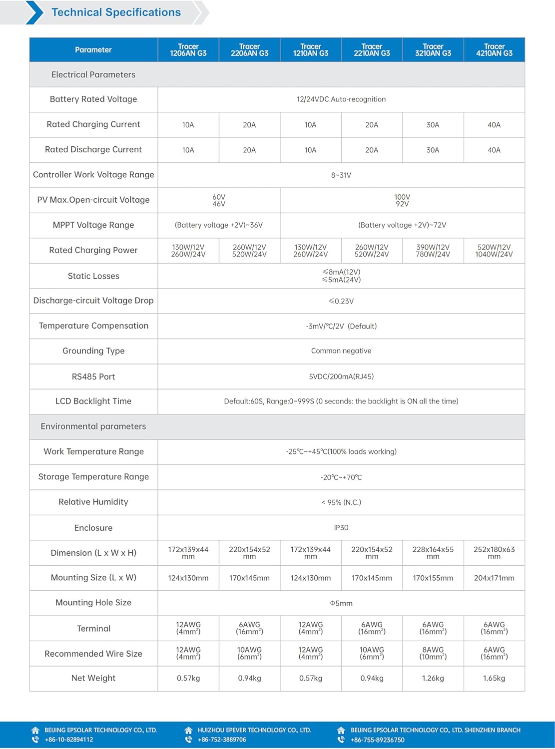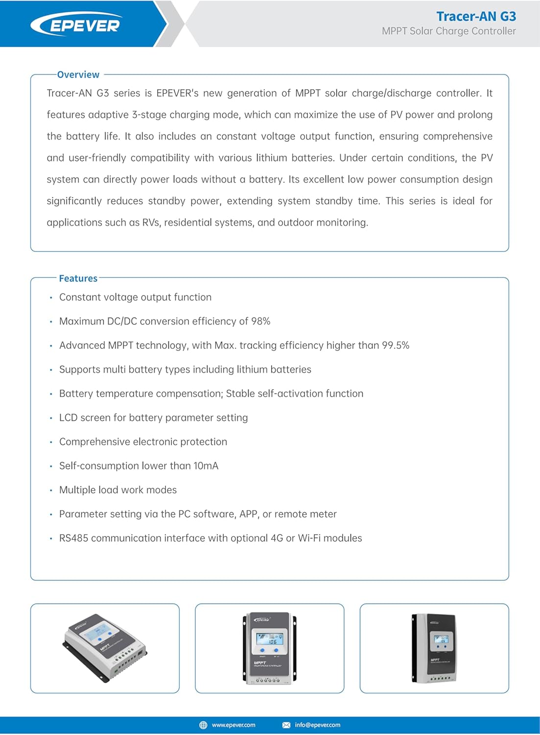 The Tracer-AN G3 MPPT Solar Controller is the next step in solar management technology, providing substantial improvements over previous models. As a cutting-edge solar power controller, it ensures maximum energy harvest through its MPPT technology, adapting to various solar conditions with precision. The controller supports a wide range of battery types and offers enhanced safety features, including overcharge protection and automatic system voltage recognition, which enhances its versatility in different solar power setups.