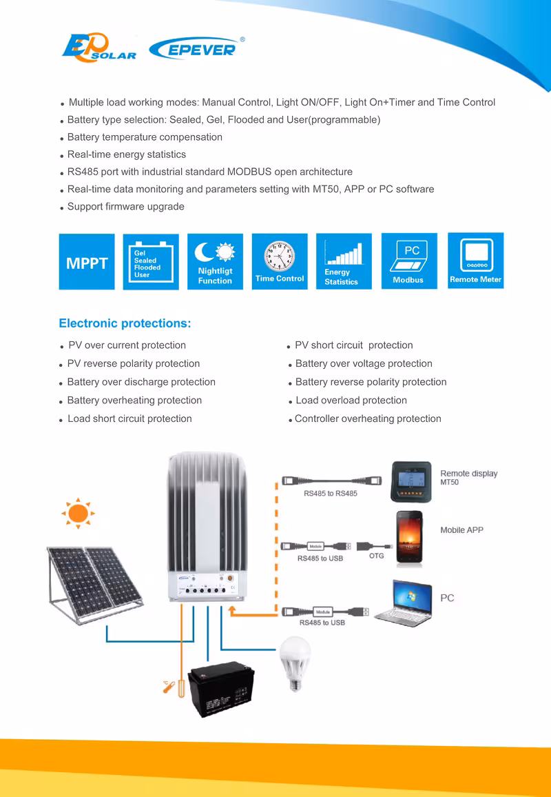 ● RS485 port with industrial standard MODBUS open architecture , Real-time data monitoring and parameters setting with MT50, APP or PC software, Support firmware upgrade