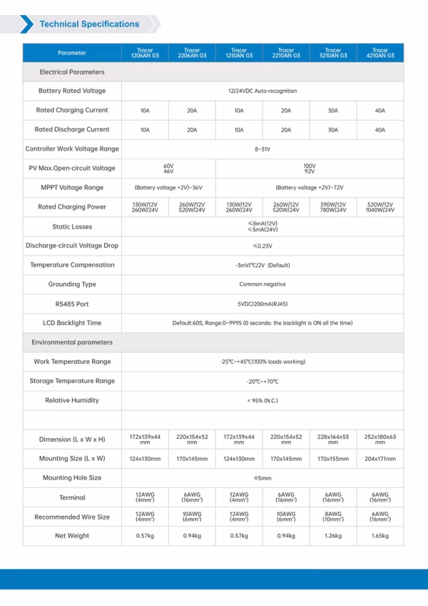 EPEVER MPPT Solar Charge Controller 40A Tracer4210AN-G3, 12V/24V auto system voltage recognition, Max PV 100V, Solar panels Max input power 520W for 12V Battery or 1040W for 24V battery. Common Negative Grounding. Upgraded G3 version independent voltage regulation constant voltage output function, ultra-quiet design solves the problem of sharp noise from previous versions of the device