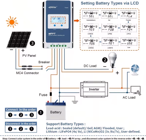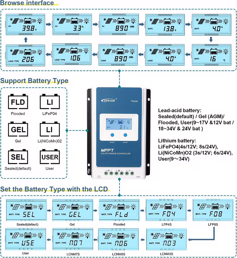 Supports multi battery types including Gel AGM Flooded Sealed and LiFePO4 Li(NiCoMn)O2 Lithium user batteries too. Battery temperature compensation function, Real-time energy statistics function, Overheating power reduction function;Multiple load work modes. Full-load operation without any drop in capacity within the range of working. Charging power and current limitation function which can ensure the product’s service life