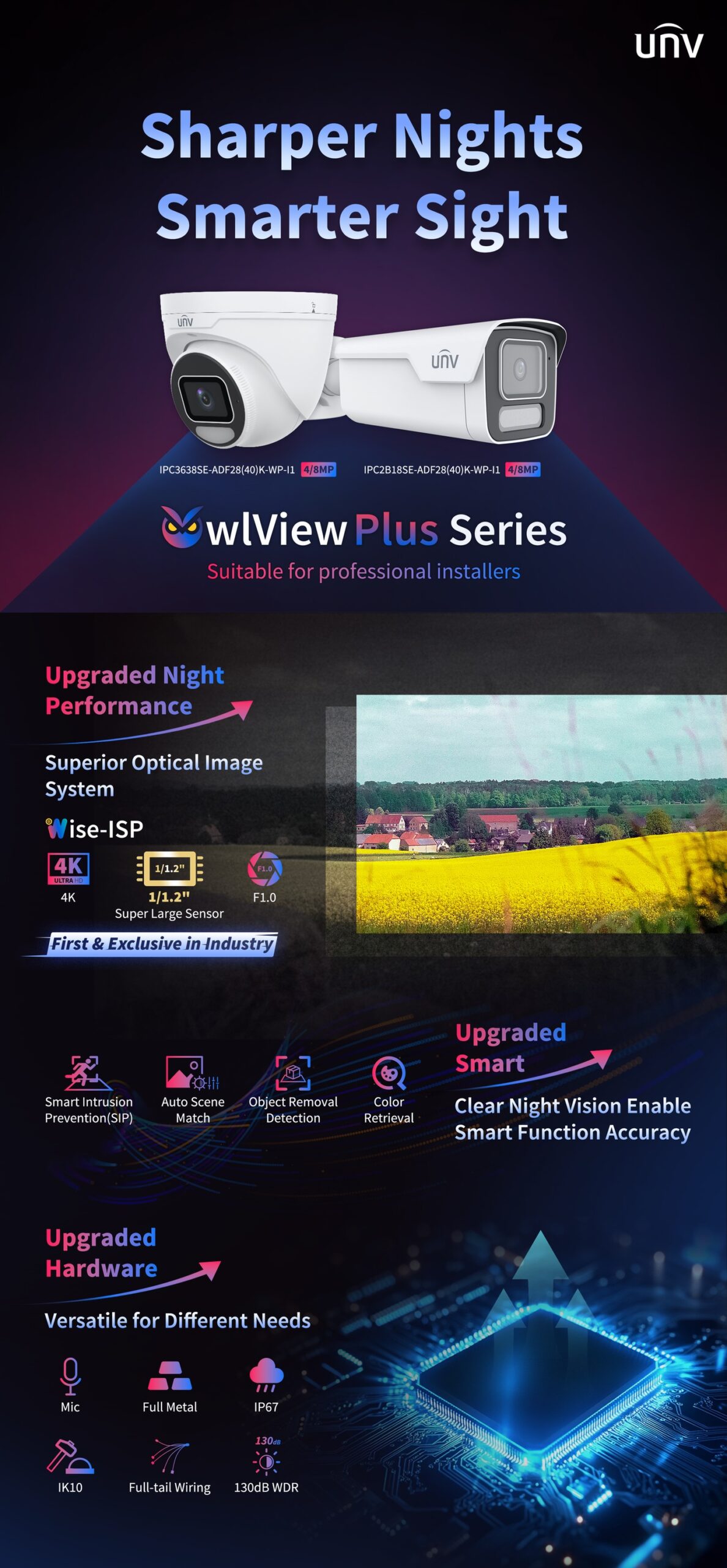 The OwlView Plus Series takes night vision to the next level with Uniview’s proprietary Wise-ISP technology, delivering enhanced clarity, color accuracy, and low-light detail.