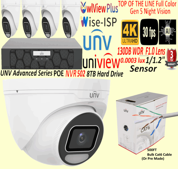 Full Ai OwlView plus 4 Camera Kit (With 8CH NVR 8TB Hard Drive And 500FT of Cat 6 Cable