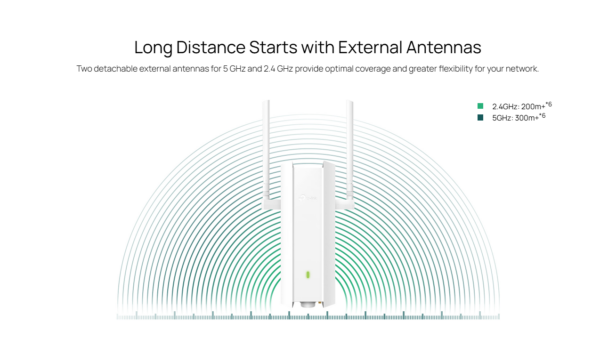 | Antenna Type | 2× External Dual-Band Omni Antennas • 2.4 GHz: 3.0 dBi; • 5 GHz: 5.0 dBi |